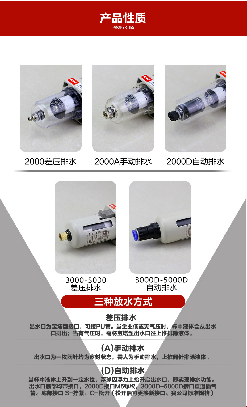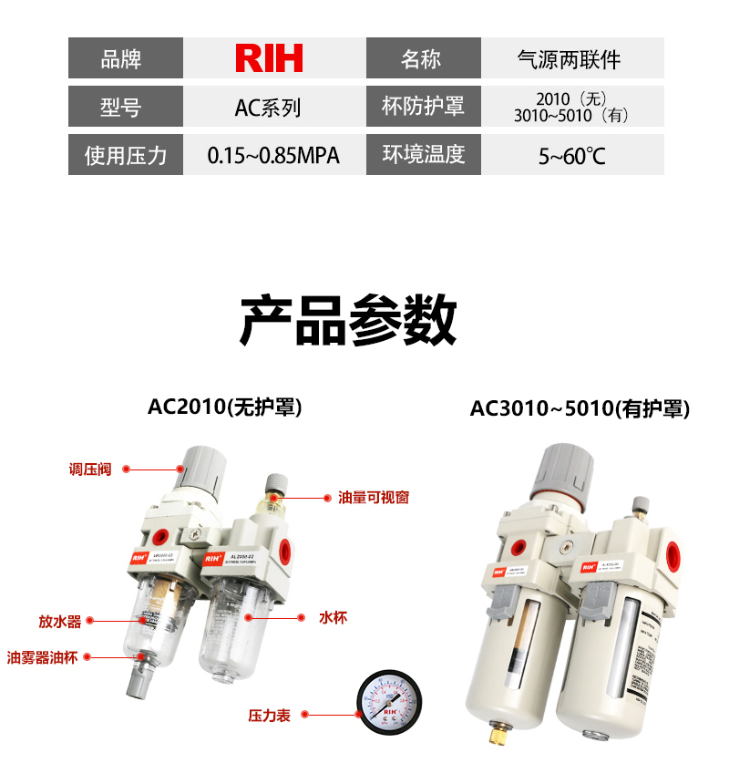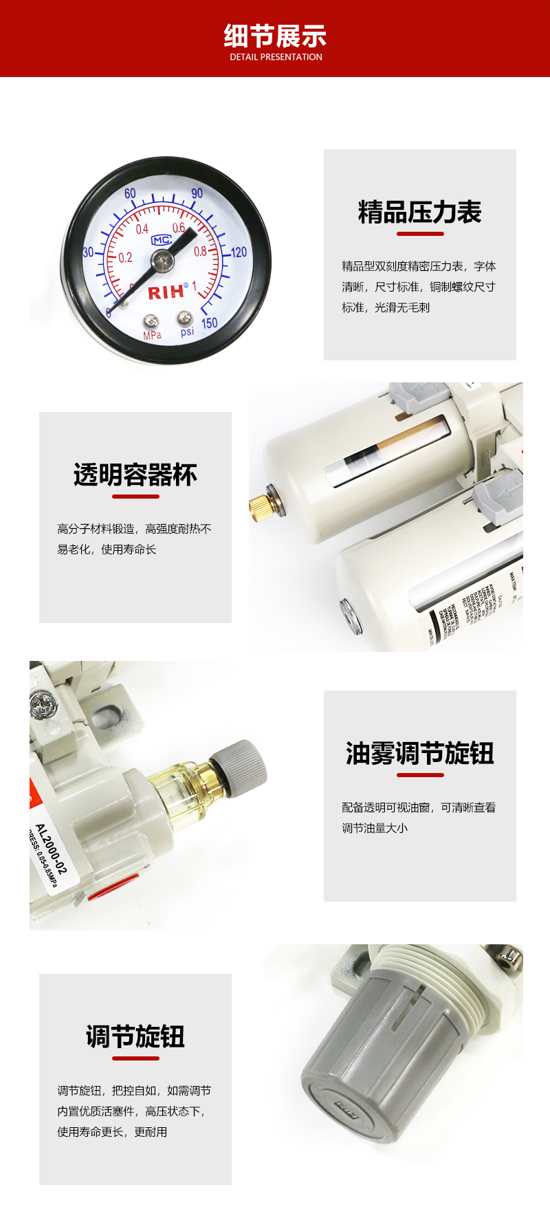 服務(wù)于自動(dòng)化系統(tǒng)配套與解決方案SMC氣動(dòng)二聯(lián)件由調(diào)壓過濾器和油霧器構(gòu)成,他的功能和三聯(lián)件是一樣的,公司生產(chǎn)二聯(lián)件能夠完全代替SMC二聯(lián)件,結(jié)構(gòu)輕巧緊湊,安裝使用方便;壓力損失小,分水效率高;透明是視察罩,可直接觀察滴油量大??;瑞亨提供最全面的氣源處理選型、銷售服務(wù)一體式,服務(wù)于自動(dòng)化氣動(dòng)行業(yè)配套與解決方案是我們不變宗旨。