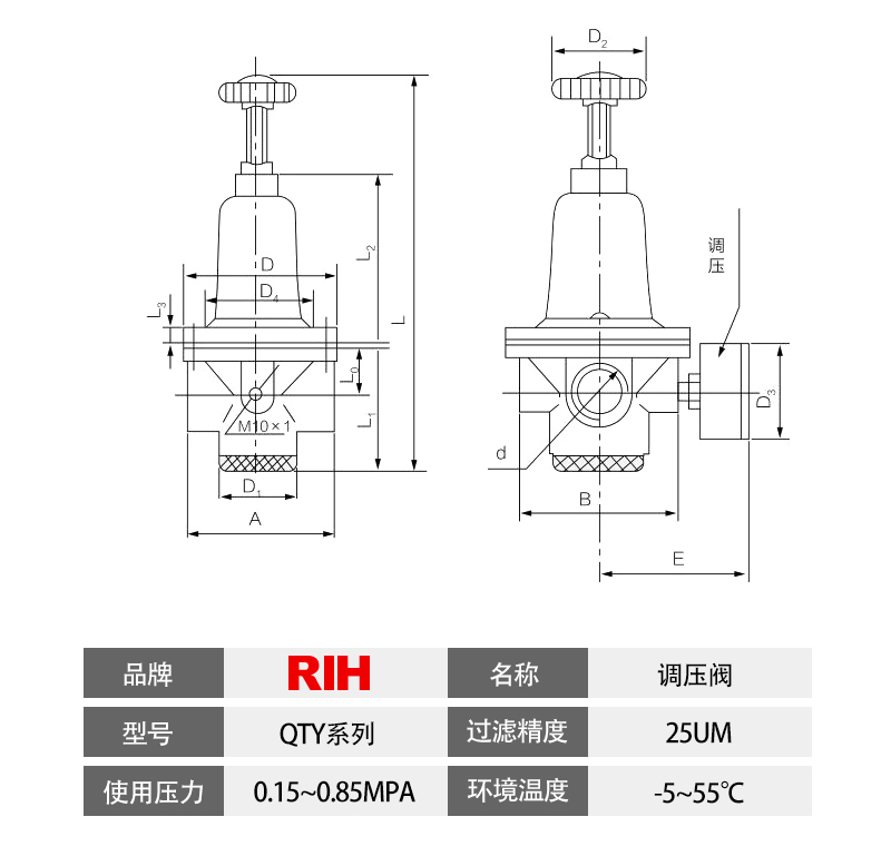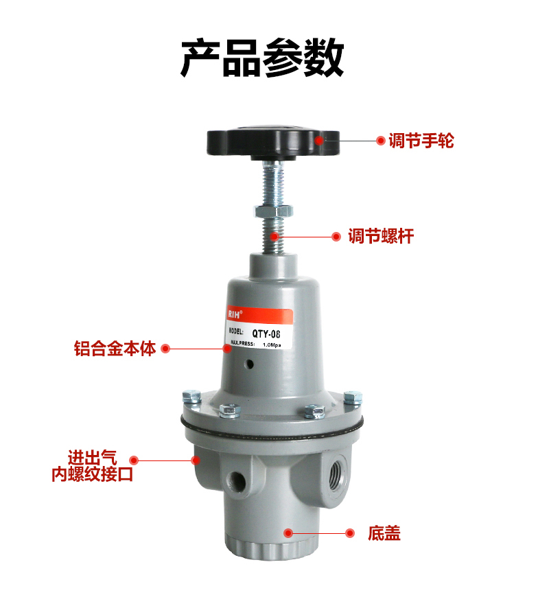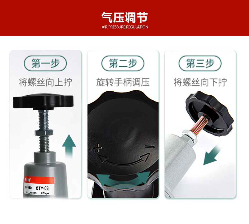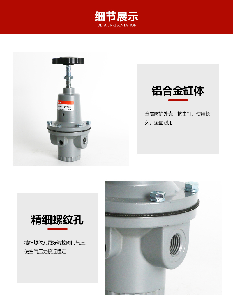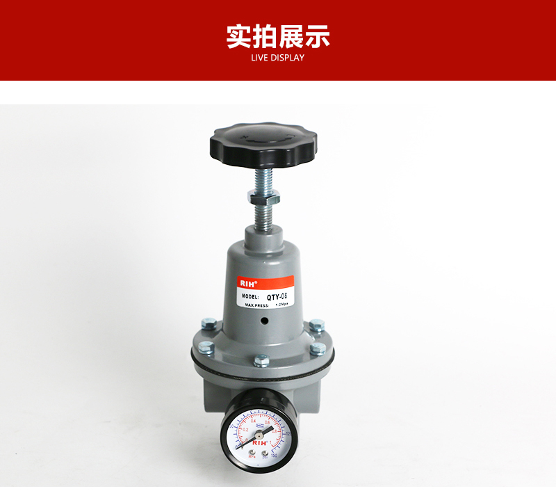 服務(wù)于自動化系統(tǒng)配套與解決方案減壓閥是氣動調(diào)節(jié)閥的一個必備配件,主要作用是將氣源的壓力減壓并穩(wěn)定到一個定值,以便于調(diào)節(jié)閥能夠獲得穩(wěn)定的氣源動力用于調(diào)節(jié)控制。QTY壓力減壓閥非常適合大口徑的管路調(diào)壓,1、為了操作和維護方便,該閥一般直立安裝在水平管道上。2、安裝時應(yīng)注意使管路中介質(zhì)的流向與閥休上所示箭頭的方向一致。瑞亨氣動提供最全面QTY空氣減壓閥選型報價及銷售。
